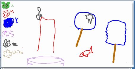 2回目のM-aiさんの絵は魚みたいで「あっ、エセじゃない」とわかりました。蘇鐵さんは私の丸い絵に棒を描いたのでお題を理解してる。