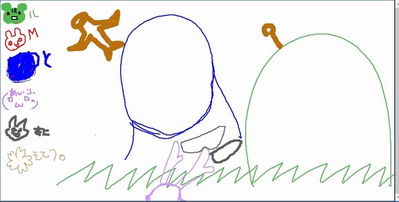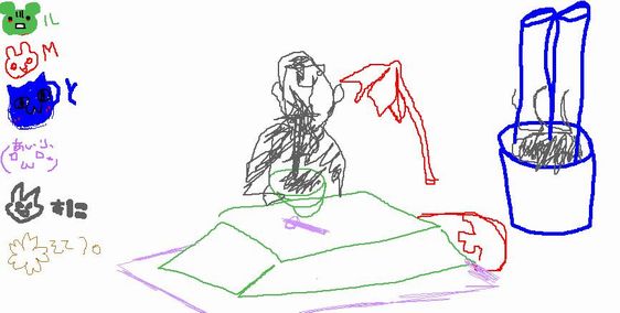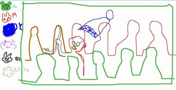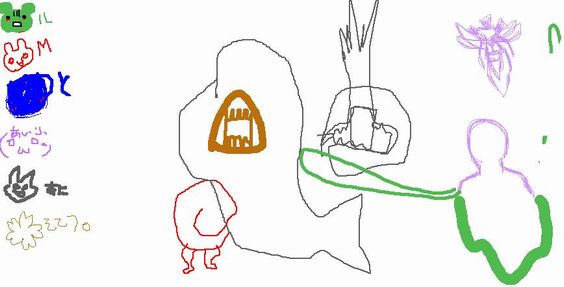 一発目が緑でノレンさん。ムンクの叫びの外側だけ?みたいなんキタコレ。トトロかしら…と思いつつ、とりあえず別口で私はカオナシを描くことに。AIRIさんが紫でトナカイみたいなのを描いて、あにさんがその上に意味わからん物体をくっつけて、蘇鐵さんがノレンさんのムンクの叫びに宇宙人の触覚みたいなのを足して一周目オワリ。